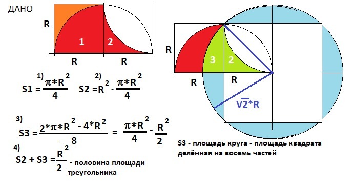 Построим окружность с радиусом равным диагонали квадрата R. Она отсечет сегмент от заданного треугольника площадью S3. Эту площадь вычислим как 1/8 площади четырех сегментов (голубых) - разность площадей круга √2*R и квадрата 2*R.