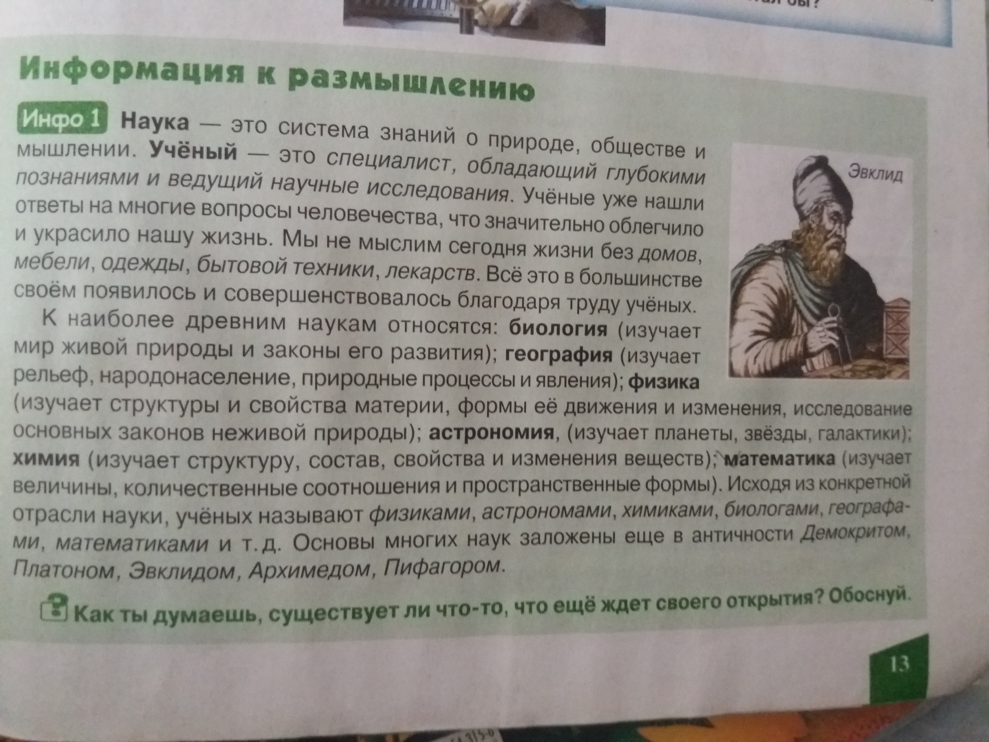 Наука-это система знаний о природе, обществе и мышлении. Учёный-это специалист обладающий глубокими познаниями и ведущие научные исследования. Биология изучает мир живой природы и законы его развития. География изучает рельеф, народонаселения, природные процессы и явления. Физика изучает структуры и свойства материи формы её движения и изменения исследование основных законов неживой природы. Астрономия изучает планеты звёзды галактики. Химия изучает структуру, состав, свойства изменения веществ. Математика изучает величины,количественные соотношения и пространственные формы