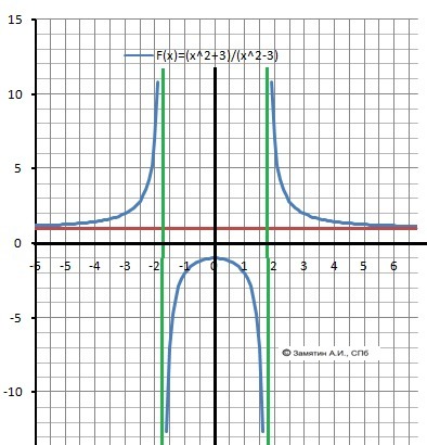 2. Вертикальные асимптоты - две: Х= -1,73 , Х= 1,73. На рисунке - зеленые.