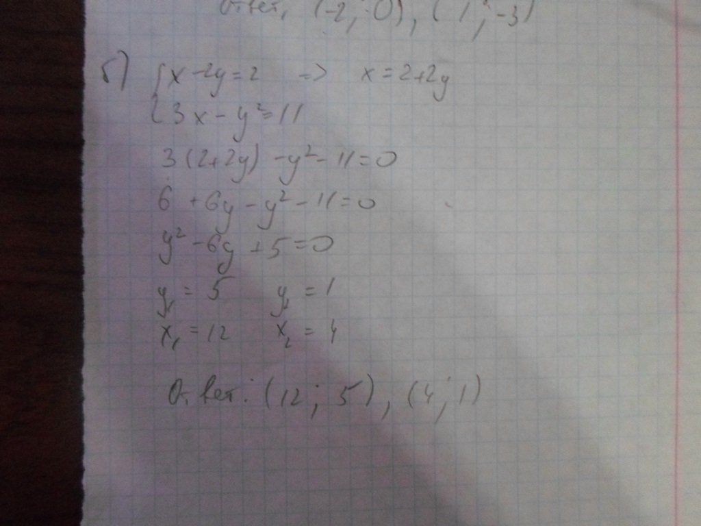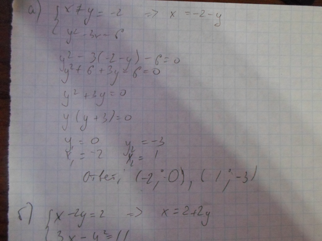 а) х=-2-у и у2-3х=6 подставим вместо х во второе уравнение его значение получим у2-3(-у-2)=6 раскроем скобки