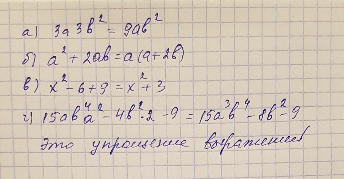 a) 3a3b2 б) a2+2ab в) x2-6+9