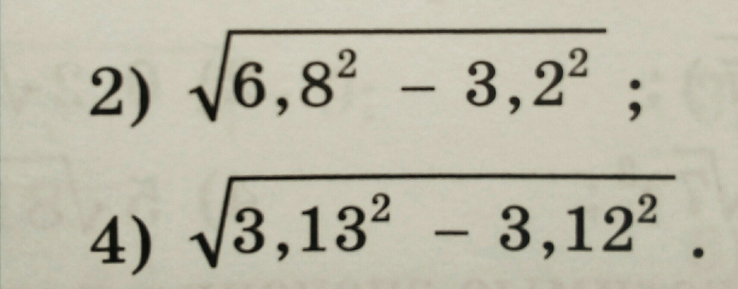 4) √(3.13² - 3.12²) = √((3.13 + 3.12)(3.13 - 3.12)) = √(6.25 · 0.01) = √0.0625 = 0.25