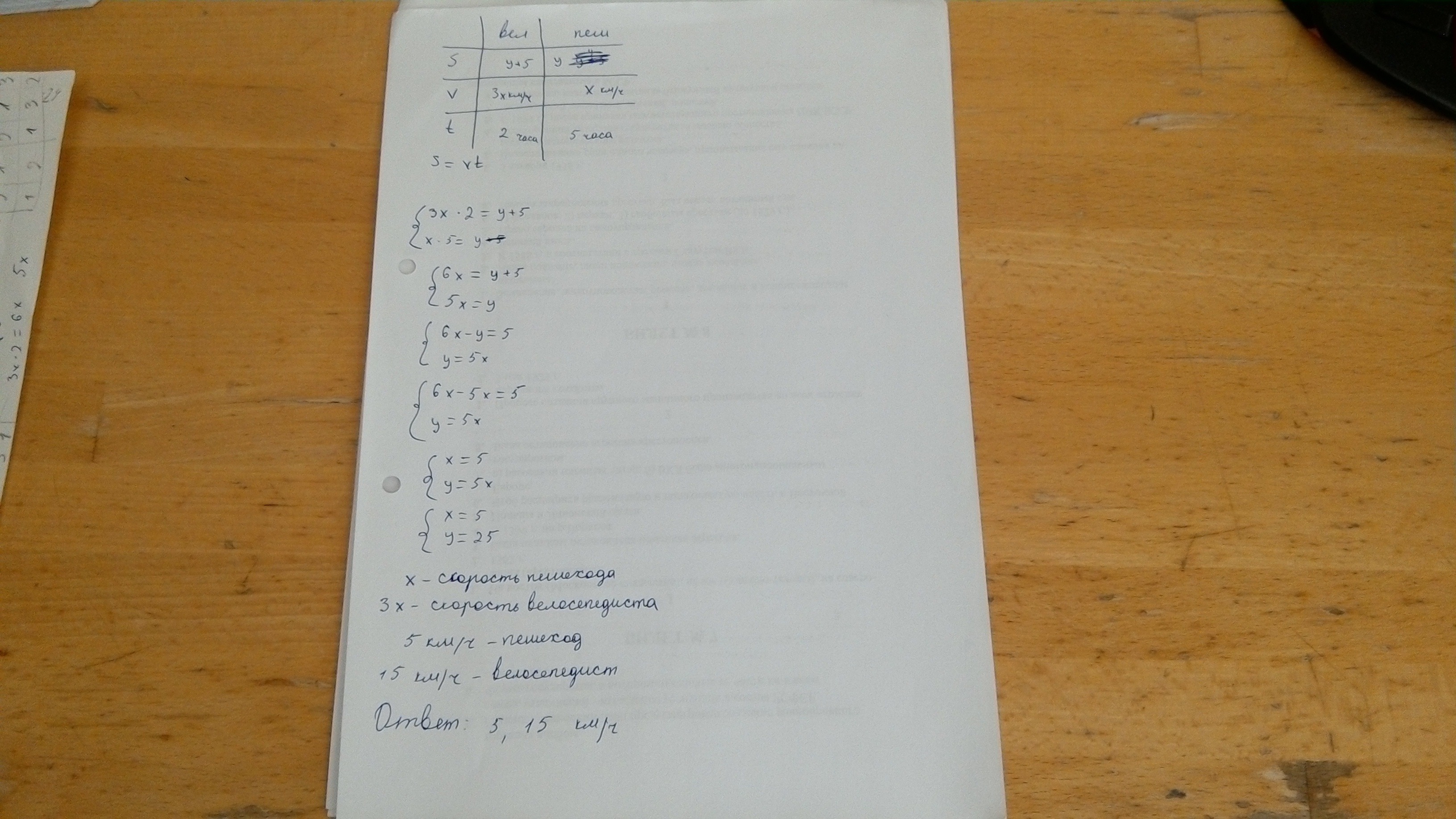 ВЕЛОСИПЕДИСТ И ПЕШЕХОД ДВИЖУТСЯ В ОДНОМ НАПРАВЛЕНИИ. СКОРОСТЬ ВЕЛОСИПЕДИСТА В 3 РАЗА БОЛЬШЕ СКОРОСТИ ПЕШЕХОДА. ЗА 2 ЧАСА ДВИЖЕНИЯ ВЕЛОСИПЕДИСТ ПРЕОДОЛЕЛ НА 5 КМ БОЛЬШЕ, ЧЕМ ПЕШЕХОД ЗА 5 ЧАСОВ ДВИЖЕНИЯ. НАЙДИТЕ СКОРОСТЬ КАЖДОГО ИЗ НИХ.