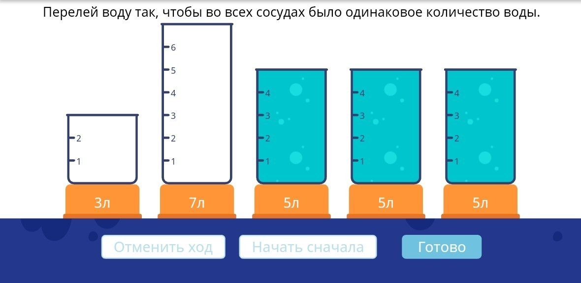 2 литра из 3 в 1, 2 литра из 4 в 2, 1 литр из 5 в 1, 1 литр из 5 в 1, так в каждой будет по 3 литра