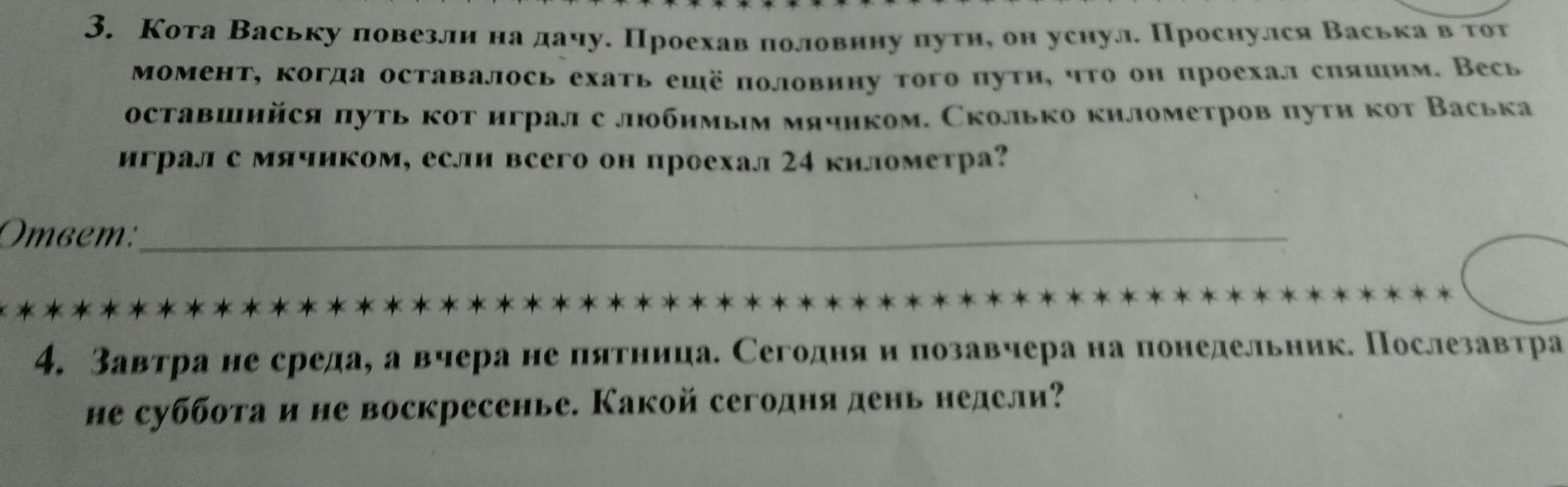 в номере 3 ответ: 6км., т.к. 24:2=12 км ( половина пути ); 12÷2=6 км путь который кот спал.