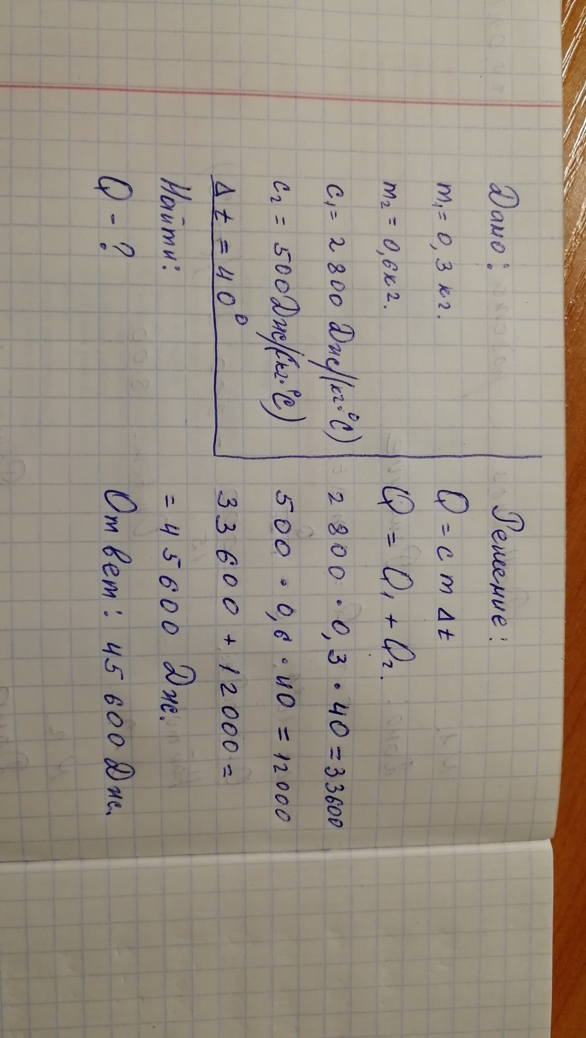 Какое количество теплоты необходимо для нагревания 300 г жидкости с удельной теплоемкостью 2800 Дж/(кг ºС) в стальной емкости массой 600 г от 10 ºгр до 50 ºгр? Удельная теплоемкость железа 500 Дж/(кг ºгр).