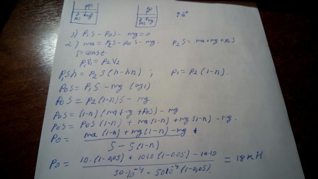 В вертикальном цилиндрическом сосуде с гладкими стенками под поршнем массой 10 кг и сечением 50 см² содержится газ. Во время движения сосуда по вертикали с ускорением 1 м/с² высота столбика газа под поршнем уменьшается на 5% по сравнению с высотой в неподвижном сосуде. Определите внешнее давление, если температура газа в сосуде постоянна, а поршень герметично прилегает к стенкам сосуда. Ускорение свободного падения 10 м/с².
