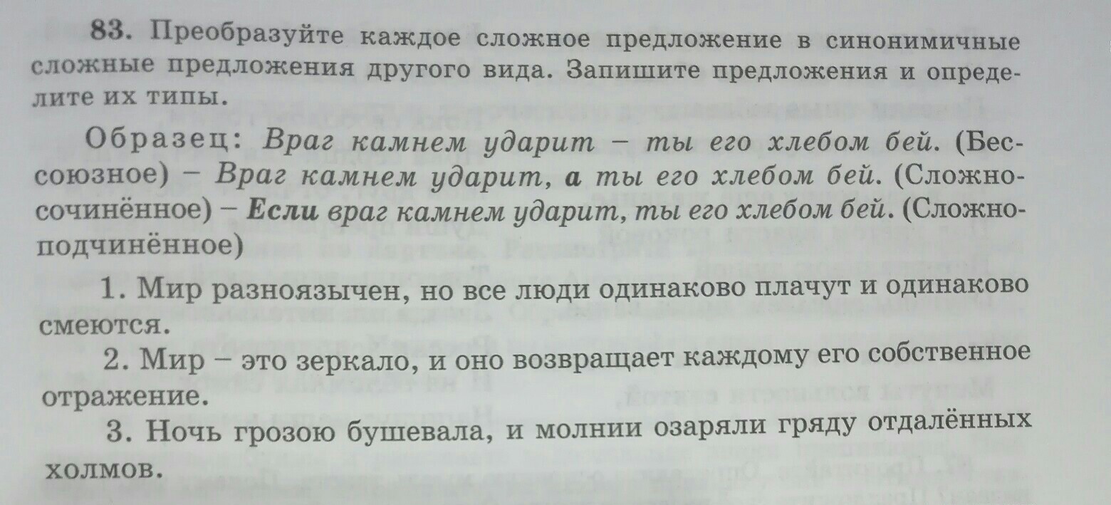 Преобразуйте каждое сложное предложение в синонимичные сложные предложения другого вида. Запишите предложения и определите их типы.