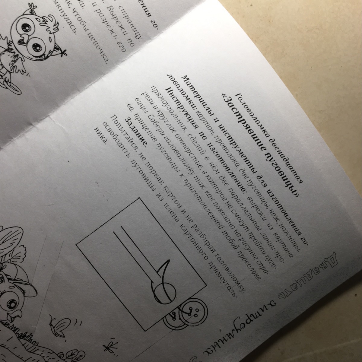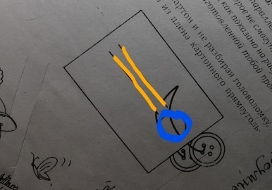 В круглое отверстие (синее на рисунке-ответе) нужно просунуть полоску , которая образована двумя прорезями (желтая на рисунке-ответе). При этом полоска образует петельку. В петельку легко просовывается пуговица!