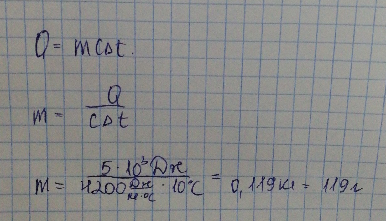 РЕШИТЕ ПОЖАЛУЙСТА! СРОЧНО!! Сколько воды можно нагреть на 10 градусов, сообщив ей 5 кДж теплоты?