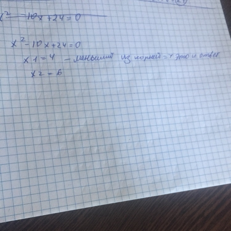 Решите уравнения x2-10x+24=0 Если уравнения имеет более одного корня, в ответ запишите меньший на корней.