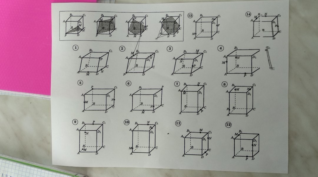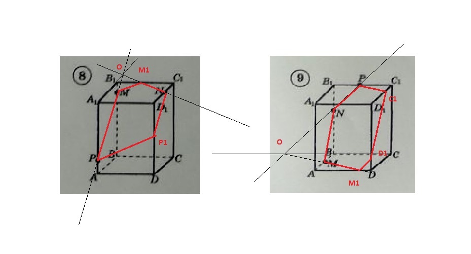 Помогите с 8 и 9! Нужно построить сечение параллелепипеда плоскостью, которая проходит через M, P, N. Можно всякие построения делать