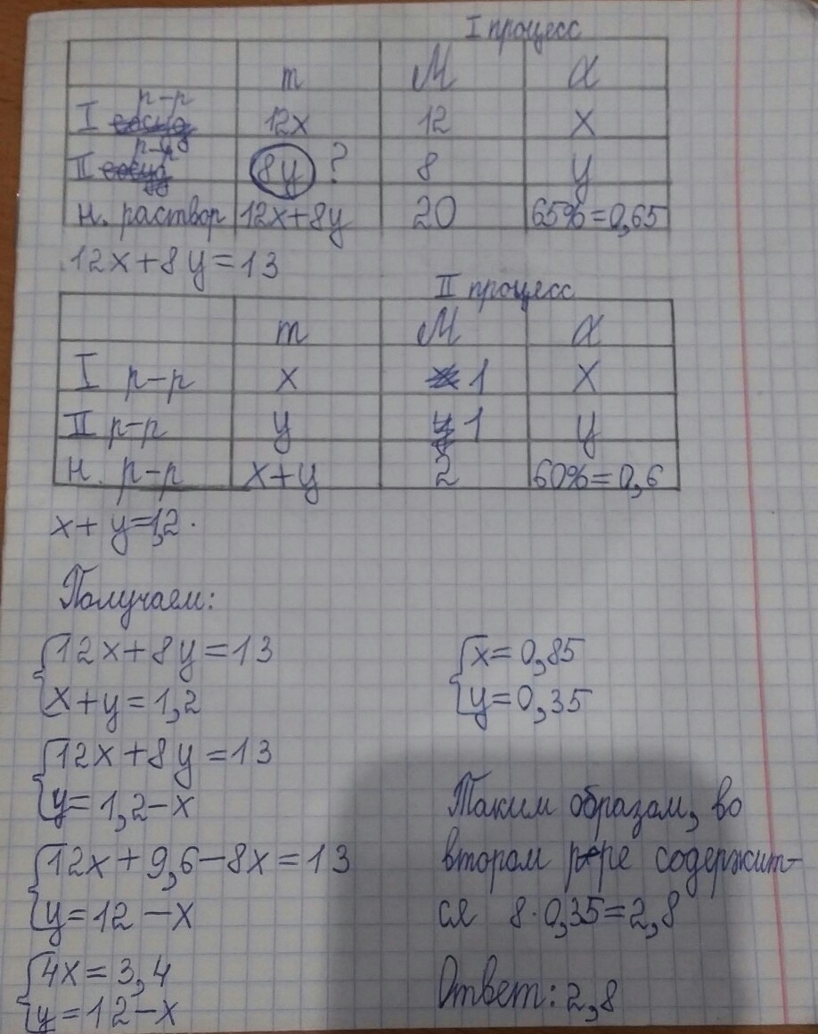 Имеются два сосуда содержащие 12 кг и 8 кг раствора кислоты различной концентрации Если их слить вместе то получим раствор содержащий 65% кислоты Если же слить равные массы этих растворов то полученный раствор будет содержать 60% кислоты Сколько килограммов кислоты содержится во втором растворе