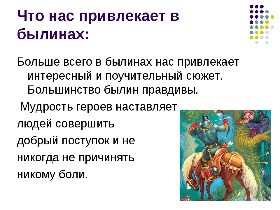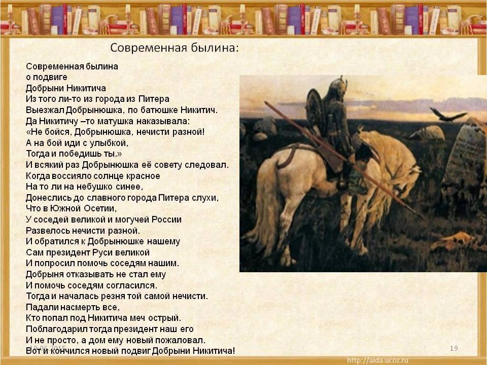 ВВЕДЕНИЕ Русь былинная… Сила и мощь духа, воля, которую не сломать никакими кознями и хитростями. Русский народный эпос – былина. Эти эпические песни, сложенные в Древней Руси, отражают историческую древность, относящуюся главным образом к XI-XVI векам. Богатыри – символ Руси, наше национальное достояние и гордость. Героические песни – былины - дошли к нам из глубины веков. Воспевая богатырей, защитников родины, былины звали на подвиг во славу Отечества, укрепляли в тяжелые для страны годы дух народа, воспитывали любовь к родной земле и ненависть к тем, кто пытался ее покорить огнем и мечом. Известный исследователь былин Круглов отмечал: «Пример непобедимых богатырей, созданных народным искусством, вселял в людей мужество, укреплял чувство долга, чести. И разве нет правды в том, что славные русичи, несмотря на временные поражения, всегда оказывались победителями? Не смогли покорить Русь ни печенеги, ни половцы, ни монголо-татары». Множество былин дошло до нашего времени. Большинство из них посвящено ратным подвигам богатырей. Былина – не самый популярный сегодня жанр фольклора. Почему? Что в наше время былины вряд ли могут появиться, потому что неясно, о ком писать? Богатырей у нас в России и сегодня немало, только о них все больше боевики снимают, а вот с былинами и, правда, как-то не встречаемся. Сегодня, когда зачастую наблюдается равнодушие и потеря интереса поколений к героическому прошлому, когда разрушаются традиционные способы передачи культуры от родителей к детям, что в итоге ведет к деградации общества в целом, необходимо уделять особое внимание ратной истории России, позволяющая на реальных, доступных примерах открыть перед нами нравственные ценности русского народа: трудолюбие, милосердие, любовь к родной земле, которая выражается в защите и воспевании. А этому, я считаю, способствует былина. Поэтому и выбрала тему своей работы «Жизнь былин в наше время», в процессе изучения которой узнала историю развития былины, как она жила и живет в наши дни. Задачи этой научно-исследовательской работы являются: • Изучить прошлое былин; • Выявить их актуальность в современное время; • Показать роль былины в развитии русском художественном искусстве; • Найти отражение жизни былин в современном кинематографе; • Проследить трансформацию образов богатырей в мультипликации. Цели моей работы: показать жизнь былины, определить ее роль в современном мире. А также проследить и доказать, что образ богатырей присущ не только нашим предкам, но и нам, ныне живущим. Из века в век древние сказания о сильных и отважных героях захватывали воображение людей. Не раз переиначенные в угоду времени, эти легенды всё же сохранили героический дух тех времён. Подобные подвиги – душа и сердце всякого героического эпоса, прославляющего идеалы языческих племён Северной Европы, которые, впрочем, оставили заметный след и в христианской традиции. В тесно сплоченных племенных общинах верность своему роду и вождям возводилась в ранг абсолюта, а отвага и боевые искусства почитались как наивысшие доблести. Под влиянием христианства и средневекового феодализма древние сказания претерпели немало изменений, но их героический дух сохранился до наших дней. Запросы воинственной аудитории стали причиной появления образа идеального поэтического героя. Храбрый,