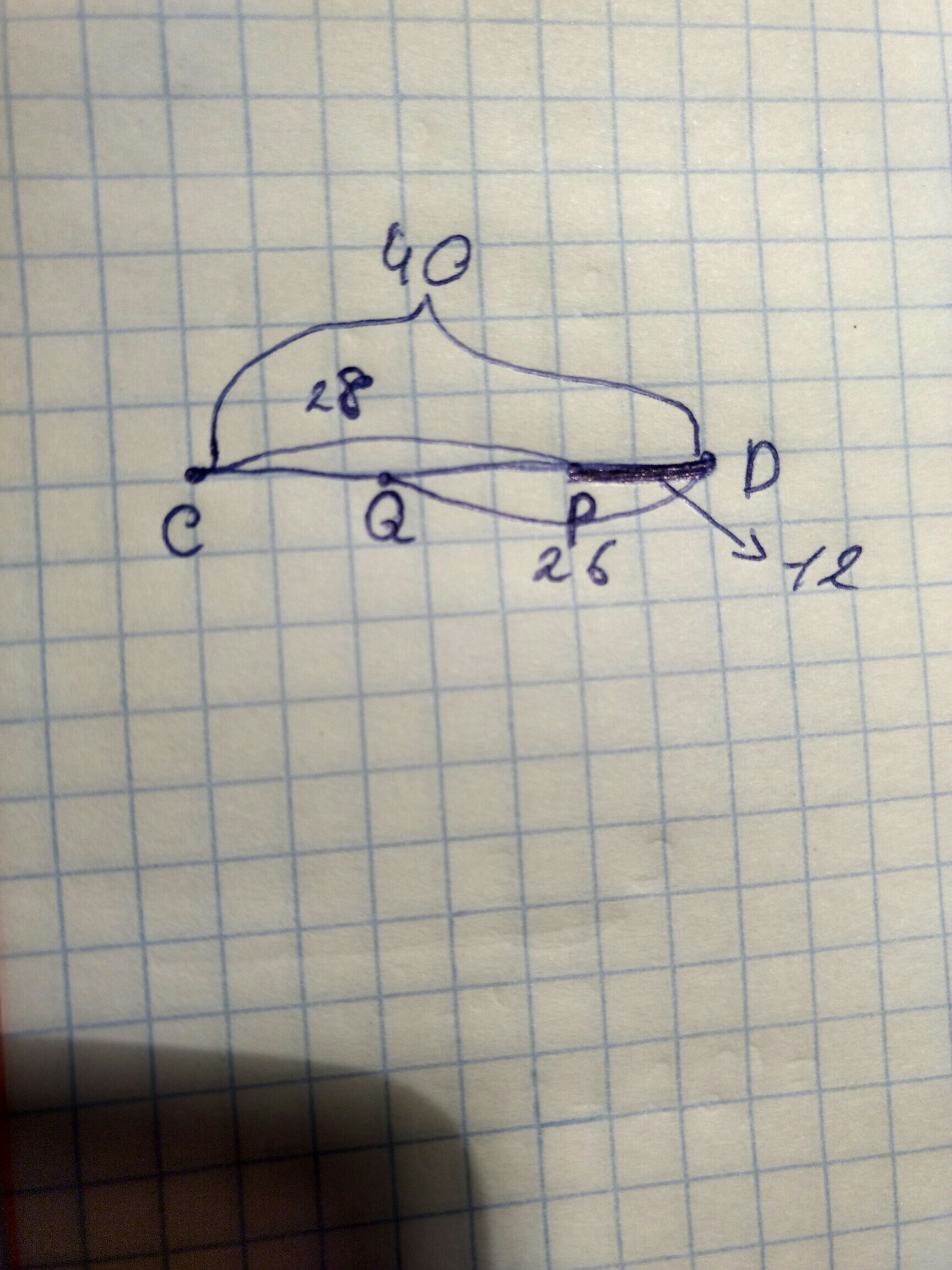 На отрезке CD длиной 40 см отмктили точки P и Q так, что CP=28 см, QD=26 см. Чему равна длина отрезка PQ?