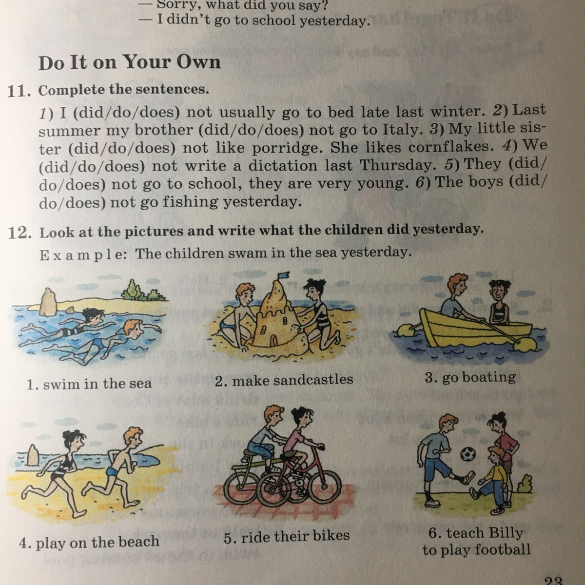 11. 1) I did not usually go to bed late last winter. 2) Last summer my brother did not go to Italy. 3) My little sister does not like porridge. She likes cornflakes. 4) We did not write a dictation last Thursday. 5) They do not go to school, they are too young. 6) The boys did not go fishing yesterday.