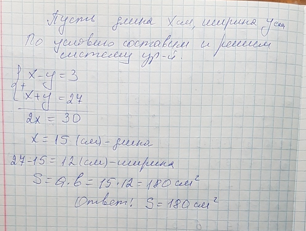 Ширина прямоугольника на 3 см короче его длины,а их сумма равна 27 см.Найдите площадь прямоугольника.