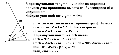 am = cm (cm - медиана из прямого угла). То есть <a = <acm. <acm = <acl - <acm = 45 - x. <ach = 90 - <a = 90 - <acm. <mch = <ach - <acm или <mch = 90 -(45-x) - (45-x). Или <mch = 2x.