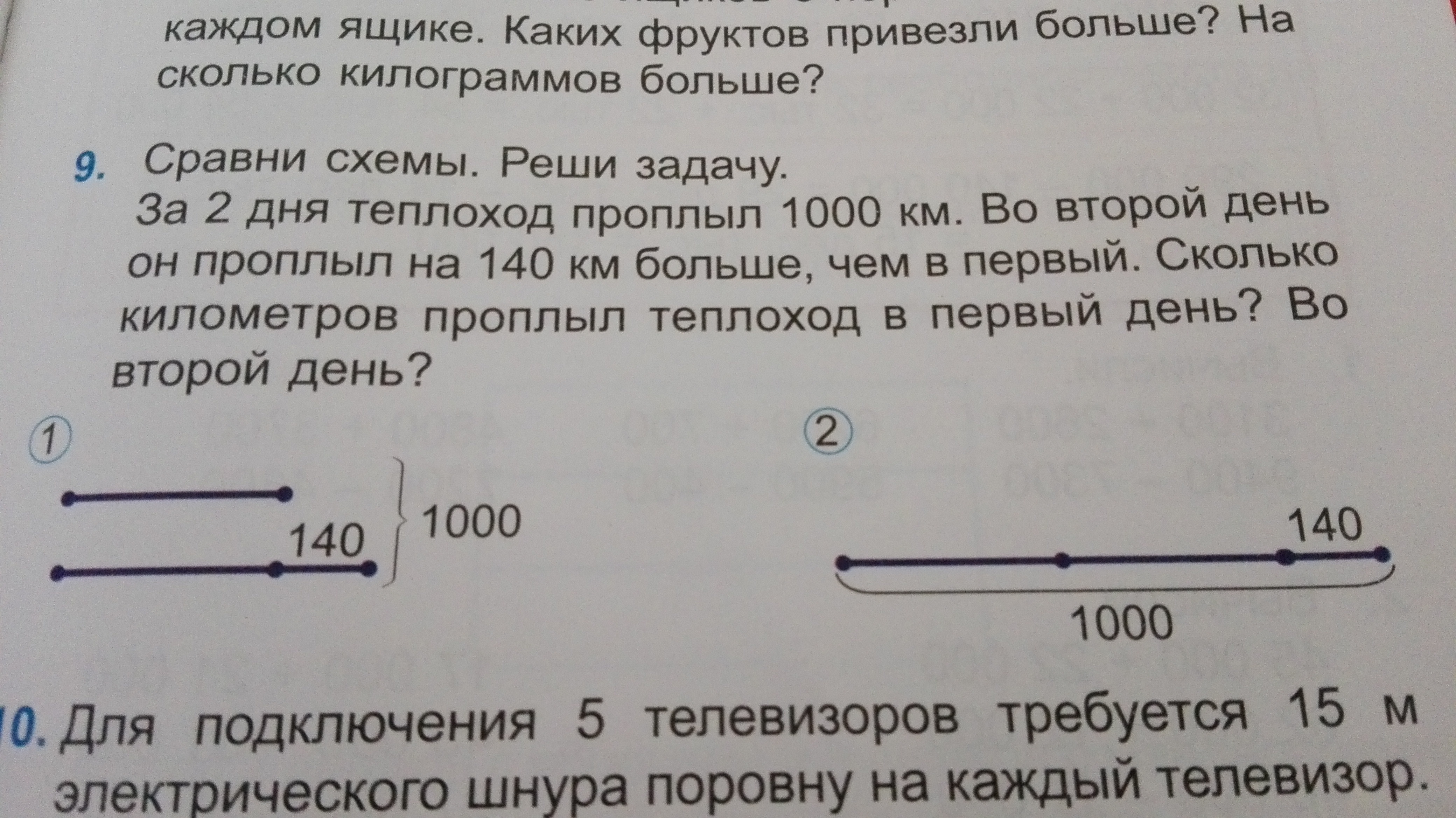 За два дня теплоход проплыл 1000 км. Во второй день он проплыл на 140 км больше, чем в первый. Сколько километров проплыл теплоход в первый день? Во второй день?