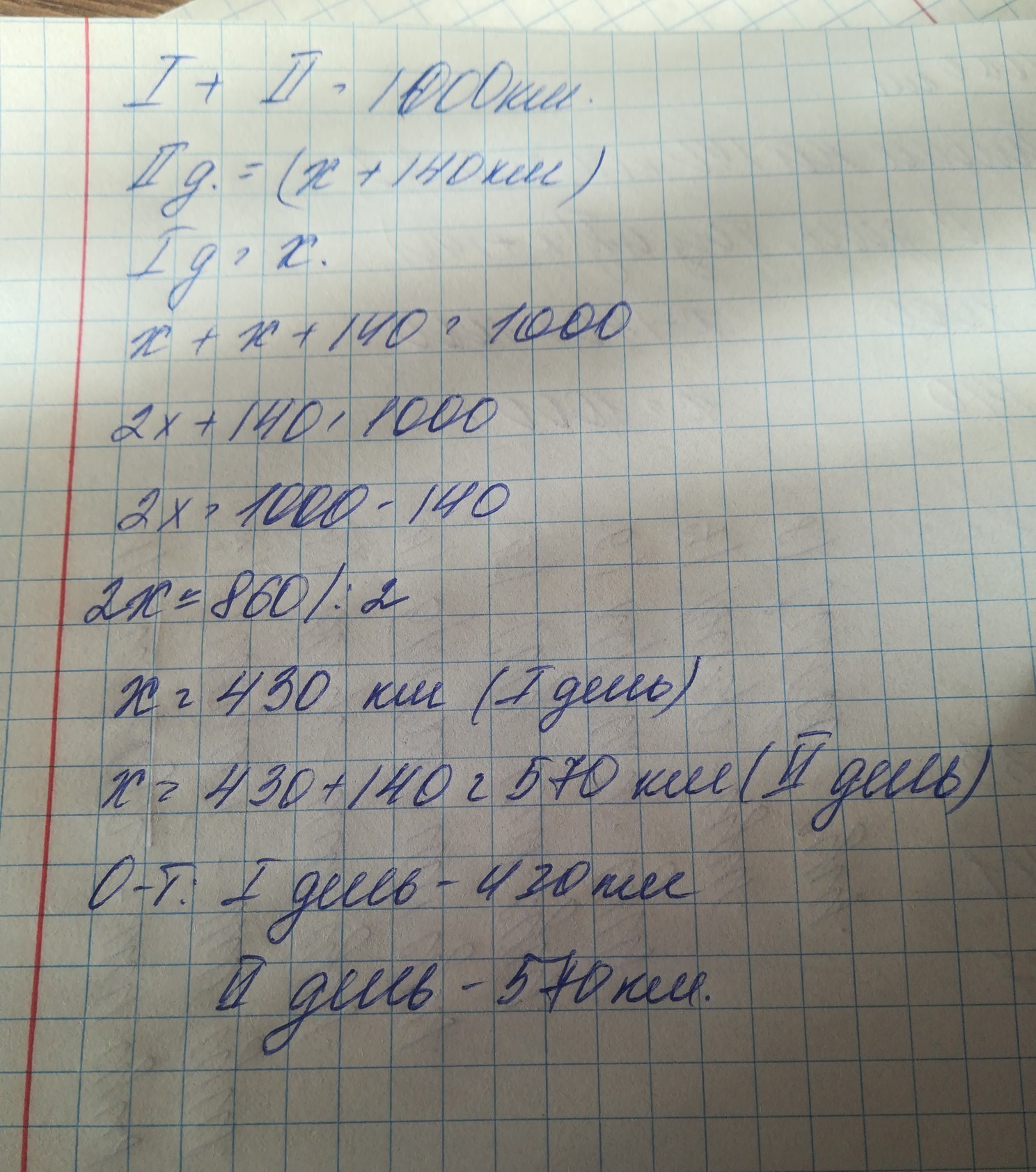 Вводим обозначения. Пусть х это 1 день, тогда х+140 это 2 день. Составляем уравнение, а дальше все есть на фото