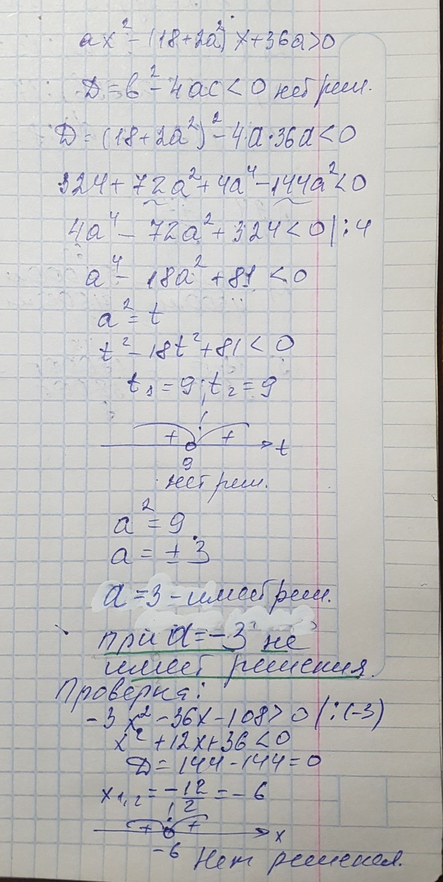 При каком значении "а" уравнение ах²-(18+2а²)х+36а>0 не имеет решений?