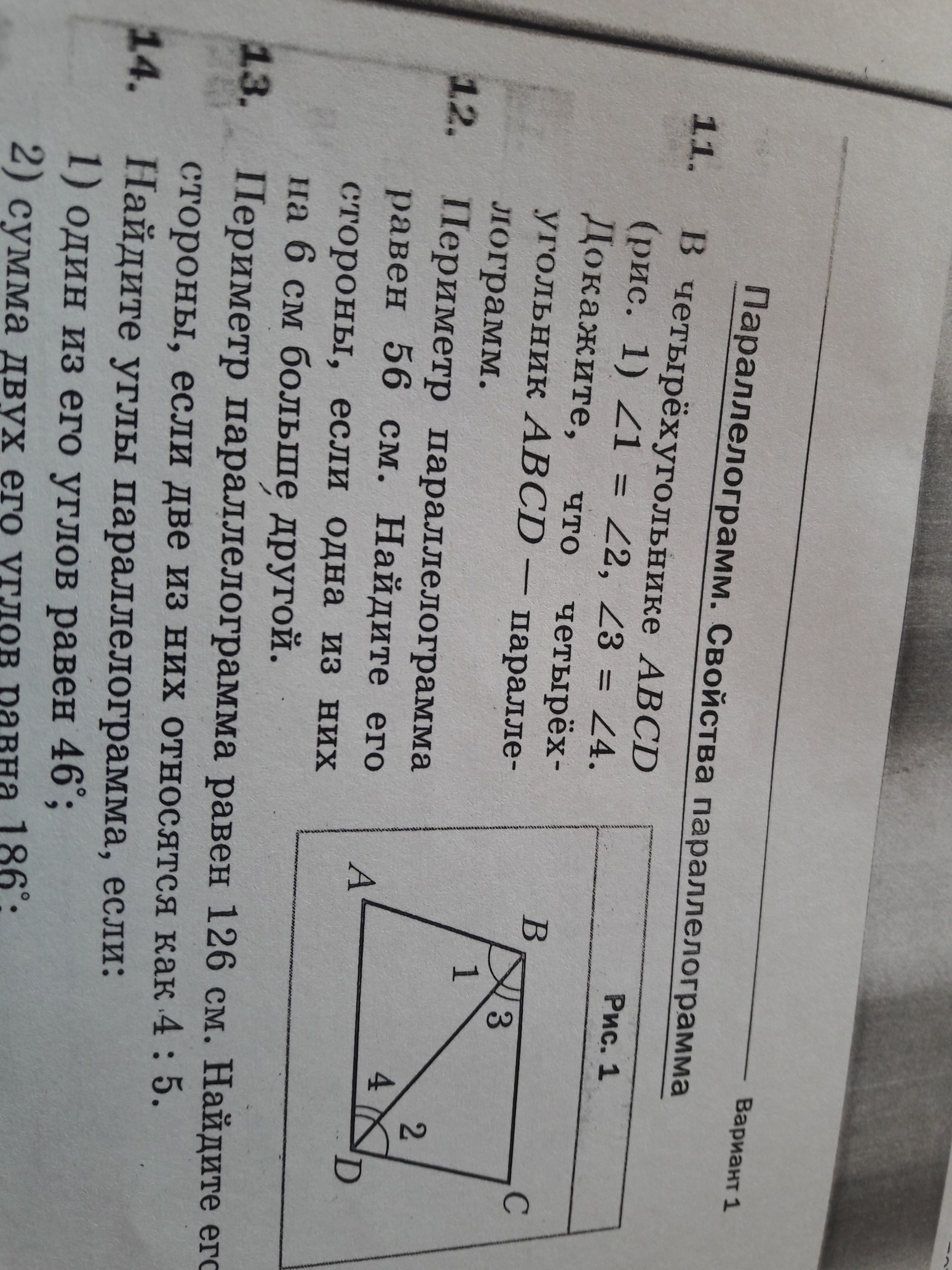 Периметр параллелограмма 2х+2(х+6)=56, 2х+2х+12=56, 4х=44 см -две противоположных стороны, (44+6)=30 см - две других стороны