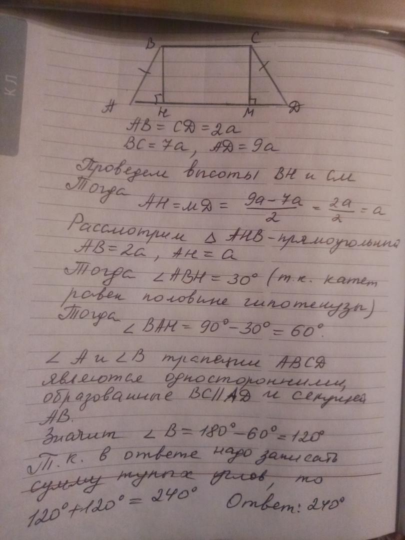 Если провести высоты из тупых углов трапеции, то они образуют два прямоугольных треугольника с катетами длинной (9а-7а)/2=а. У данных треугольников нам также известны гипотенузы, равные сторонам трапеции 2а. А поскольку отношение прилежащего катета к гипотенузе (Cos) для данных треугольников будет равно а/2а=0.5, то мы имеем угол 60°. А зная, что сумма углов выпуклого четырехугольника равна 360, остальные два угла находятся следующим образом: (360-2*60)/2=120° А их сумма соответственно 240°