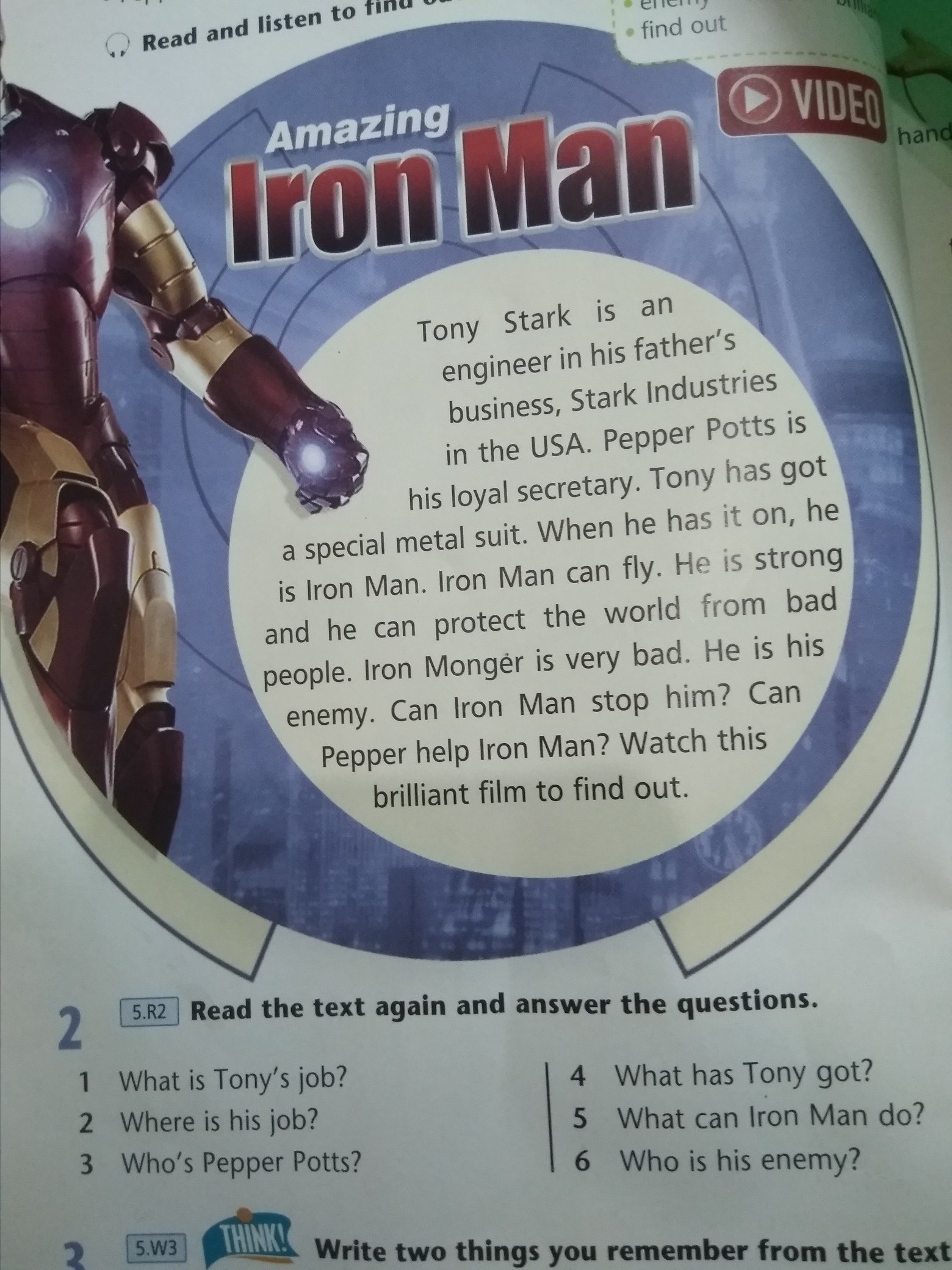 1 Tony is engineer. 2 His job is in USA 3 Pepper Potts his secretary 4 Tony has a special metal suit 5 Iron man can fly and protect the world from bad people 6 Iron Monger is his enemy.
