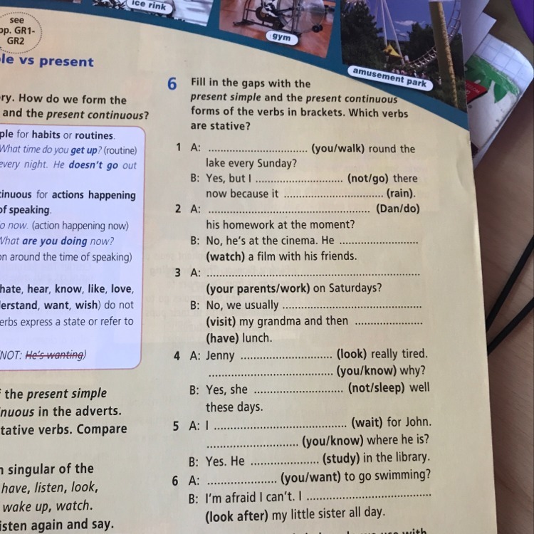 - 1 A. Do you walk, B. I am not going ... it is rain 2 A. is doing, B. he is watching. 3. Are your parents work, B. visit, have. 4 A. looks , do you know why? B. she hadn't slept. 5 A. I am waiting for John. do you know where is he? B. he is studying 6 A. Are you want, B. I look after