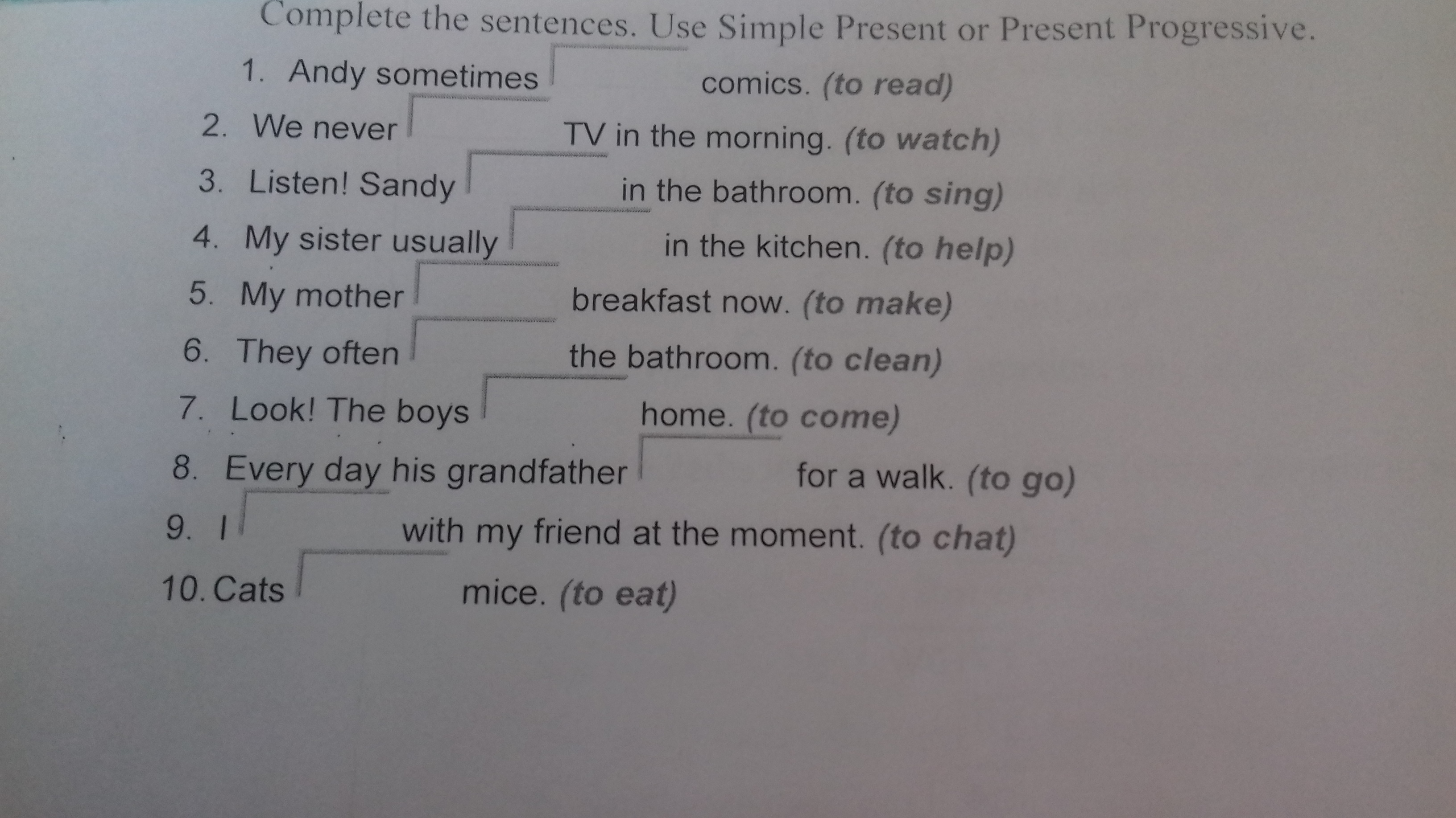 1 reads 2 watch 3 is singing 4 helps 5 is making 6 clean 7 are coming 8 goes 9 am chating 10 eat