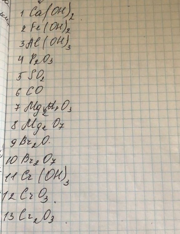 Гидрооксиды:1-гидрооксид кальция-основыный,2-гидрооксид железа-амфотерный,3-гидрооксид алюминия-амфотерный,11-гидрооксид хрома-амфотерный.Оксиды:4-оксид фосфора-кислотный5-,оксид серы-кислотный,6-оксид углерода-кислотный(угарный газ)7-оксид магния-основный,9-оксид брома-основный,12-оксид хрома-кислотный,13-оксид хрома(2)-амфотерный