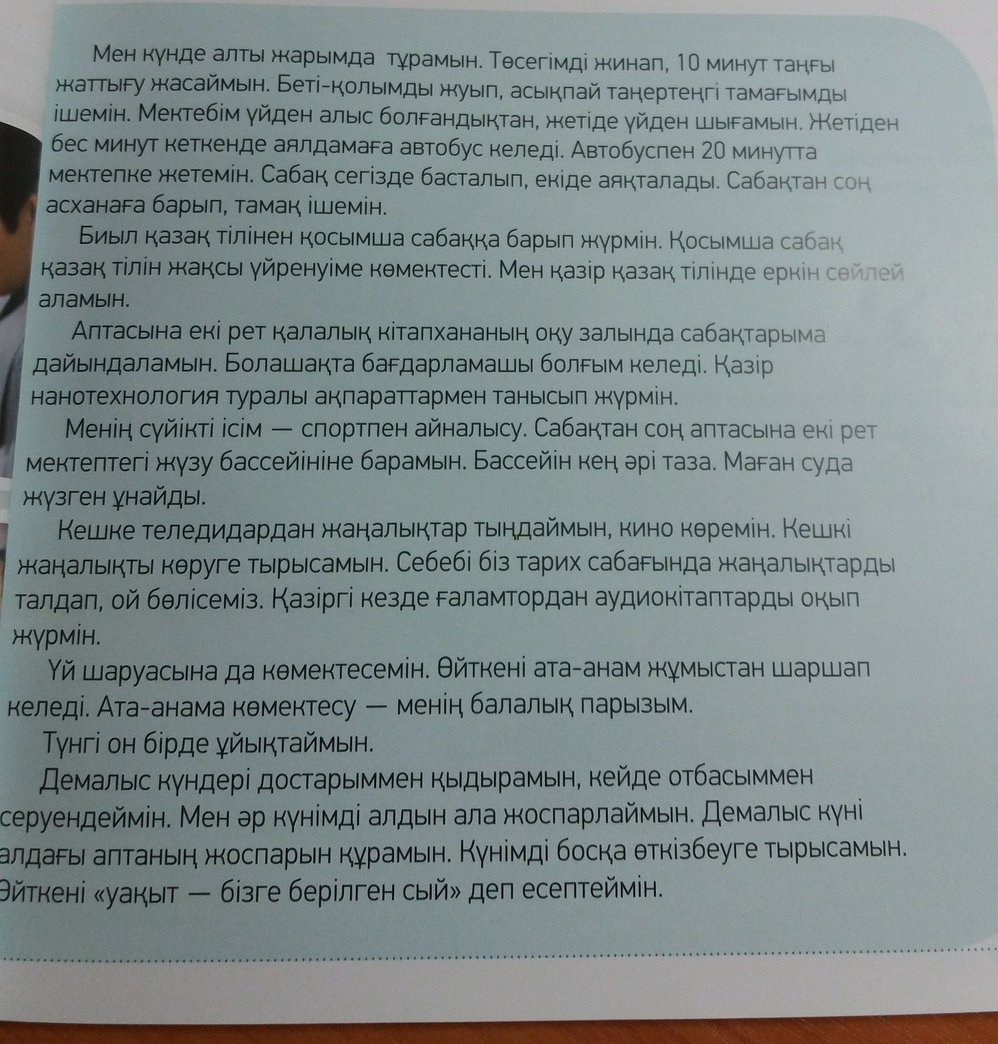 Я каждый день встаю в пол седьмого. Убираю постель и 10 мин. делаю утреннюю зарядку.Умываюсь и неспеша завтракаю.Из-за того, что школа находится далеко от дома, я выхожу в семь часов.Ровно в 5 мин. восьмого приезжает автобус на остановку. На автобусе добираюсь до школы,за 20 мин. Уроки начина-ся в 8 и заканчиваются в 2. После уроков иду в столовую поесть. В этом году хожу на дополнительные по каз. языку. Дополнительные уроки помогают в изучении каз. языка. Сейчас я могу свободно разговаривать на казахском . 2 раза в неделю я хожу в городскую библиотеку,и готовлюсь там к урокам.В будущем я хочу стать программистом. Уже сейчас изучаю информацию про нанотехнологии. Моё любимое занятие - это спорт. После окончания уроков 2 раза в неделю я хожу в бассейн в школе.Бассейн большой и чистый.Мне нравиться плавать. Вечером смотрю кино и новости по телевизору.Стараюсь смотреть вечерние новости.На уроке истории мы обсуждаем новости, и дискуссируем.На данный момент читаю в интернете аудиокнигу. Помогаю родителям по дому.Потому что родители приходят уставшими после работы.Помогать родителям - моя обязанность.Ложусь спать в 11. На выходных играю с друзьями,гуляю с семьёй. Каждый свой день я планирую заранее. На выходных составляю план на будущую неделю. Стараюсь не тратить время зря. Потому что считаю Время " - для нас подарок".