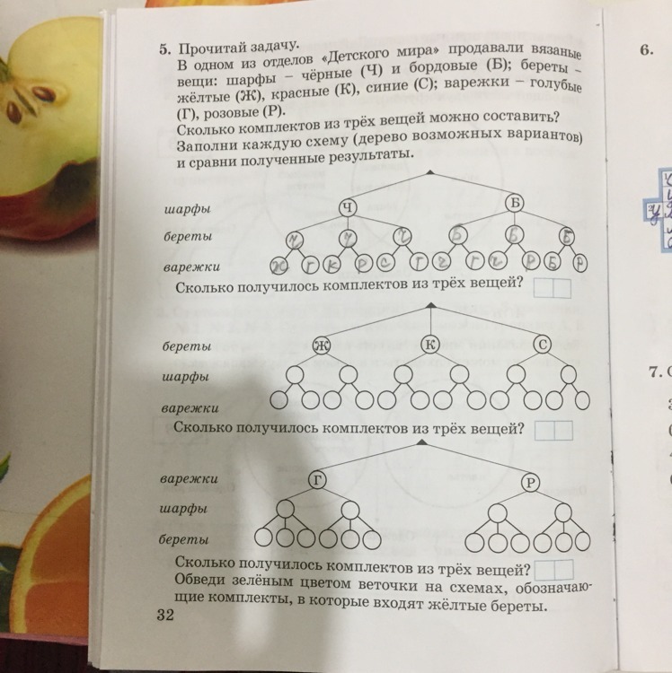 Прочитай задачу. В одном из отделов «Детского мира» продавались вязанные вещи: шарфы- чёрные (Ч) и бордовые (Б); береты- жёлтые (Ж), красные (К), синие(С), варежки-голубые (Г), розовые(Р). Сколько комплектовщице трёх вещей можно составить? Заполни каждую схему(дерево возможных вариантов)