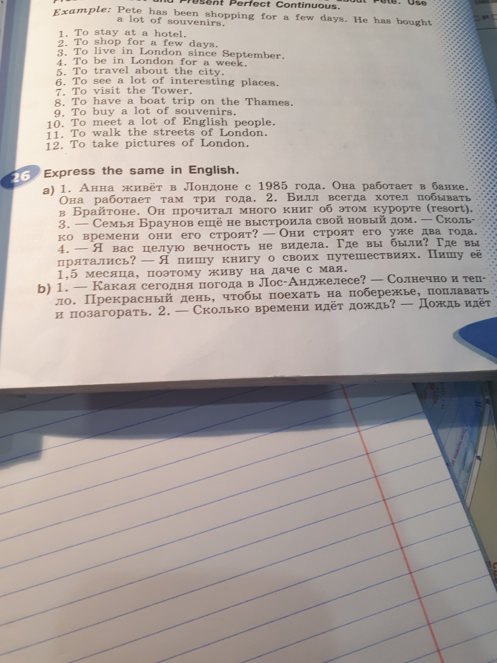1Anna lives in London since 1985.She works in a bank.She works for 3 years.2Bill always wanted to be in Braton.He read many books about this resort.3 Brown's family hasn't built a new house yet.How long do they build it?They build it for 2 years.4 I haven't seen you for so long.Where were you?I'm writing a book about my travels.I'm writing it for 1,5 month,so I live in country house since May