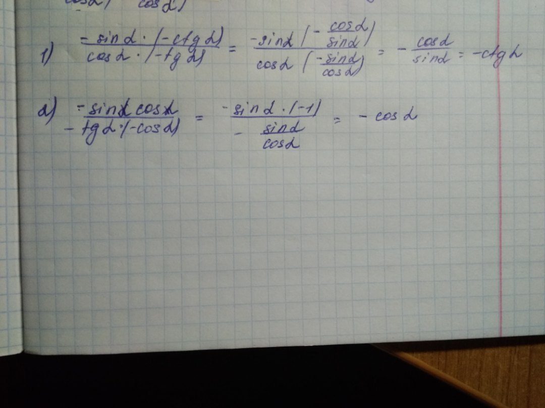 б) ( sin(-α) · ctg(-α) ) / ( cos(360° - α) · tg(180° - α) ) в) ( sin(π+α) · cos(2π-α) ) / ( tg(π-α) · cos(α-π) )