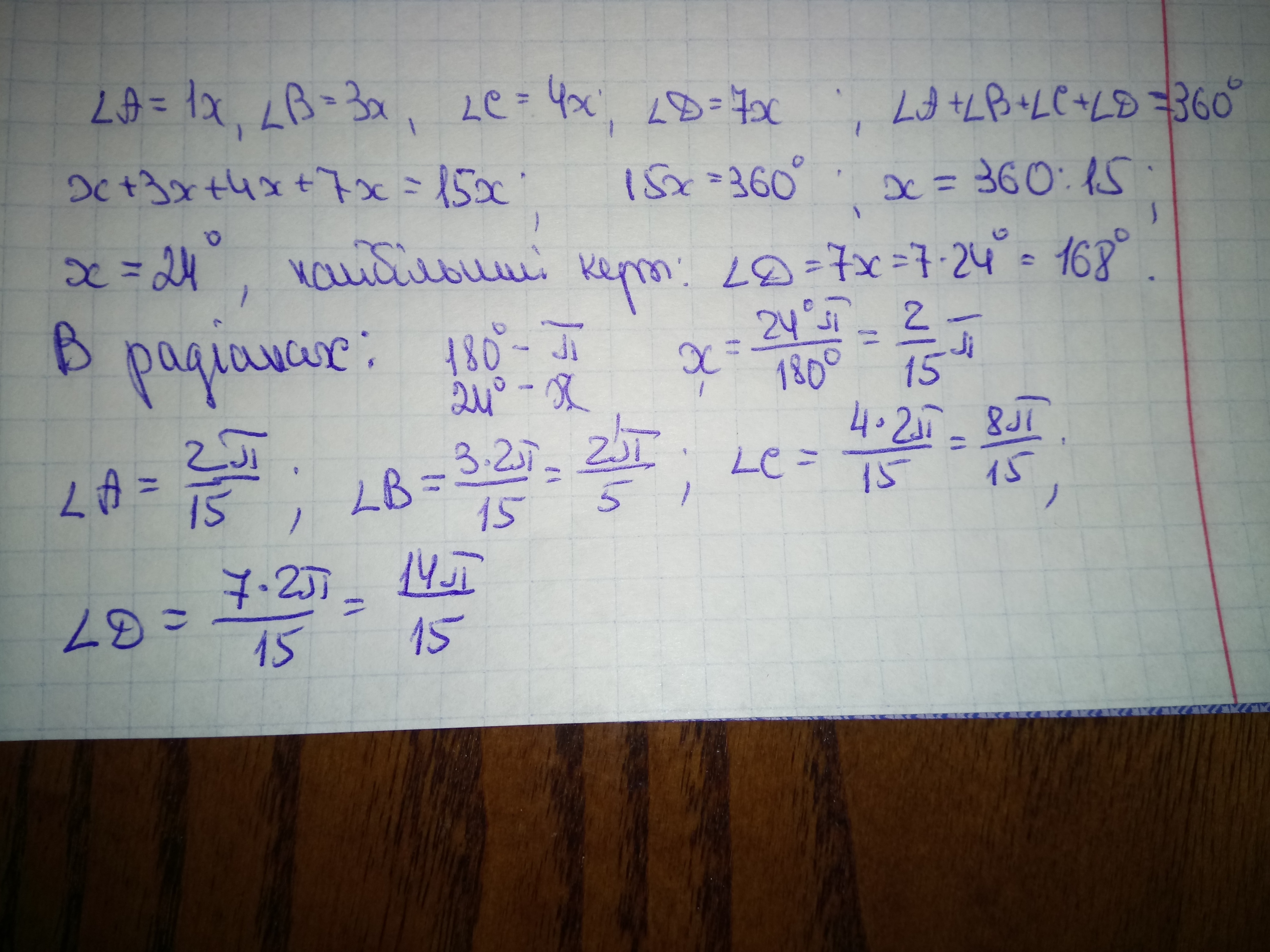 Знайдить знайбильш из кутив чотирикутника якщо вони относяться як 1:3:4:7 знайдить радиание мера його купив