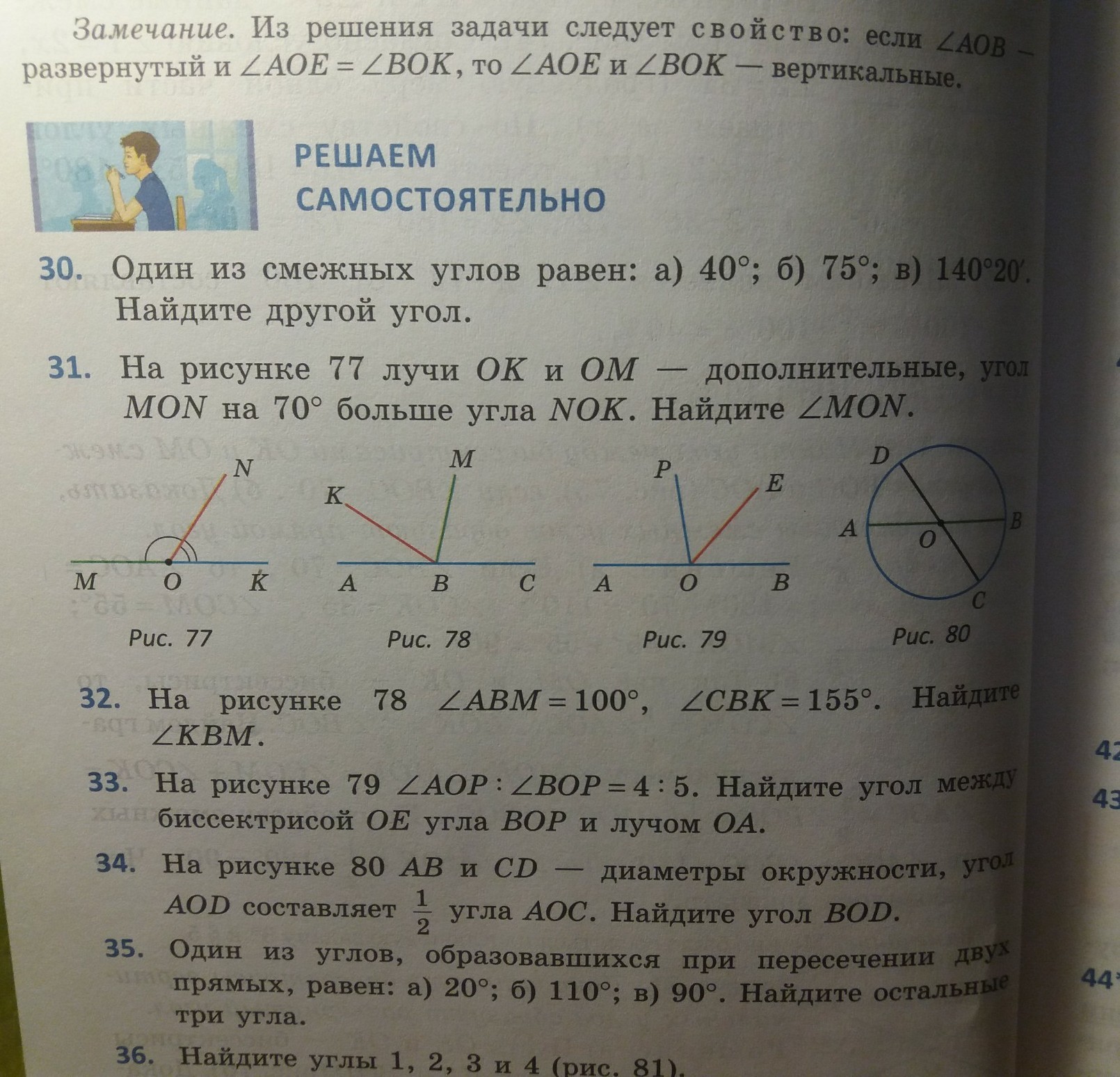 31. Сумма смежных углов равна 180°, откуда следует, что MON = 180° - 70° = 110°.