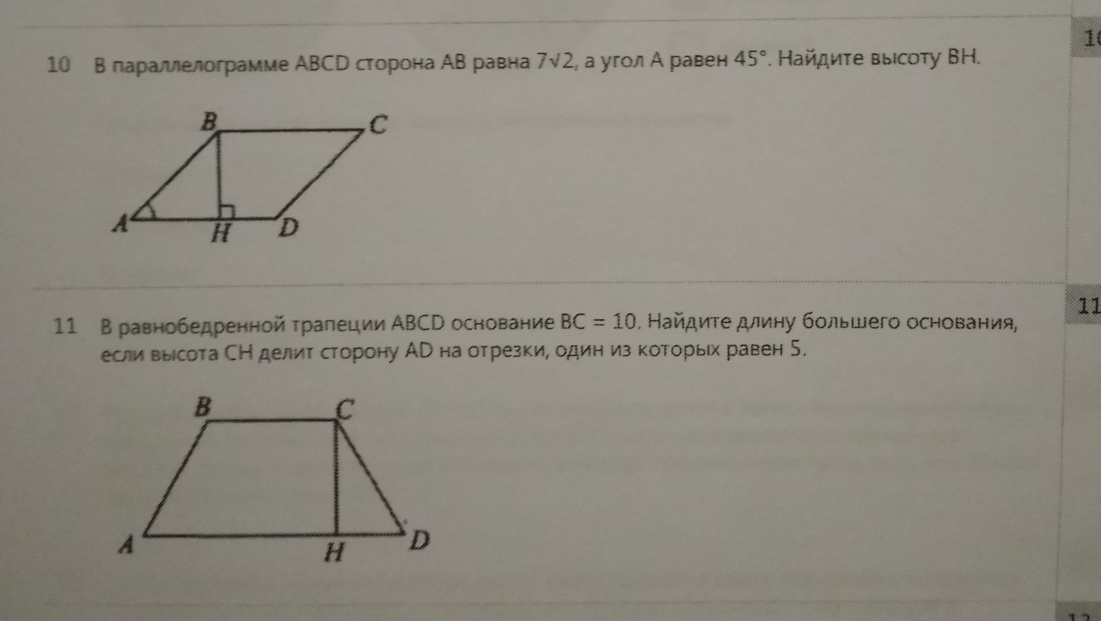 Пусть x - AH, то HD = 5, a BC = 10, то 2HD+BC=AD. Подставляем, получаем (5*2)+10=20