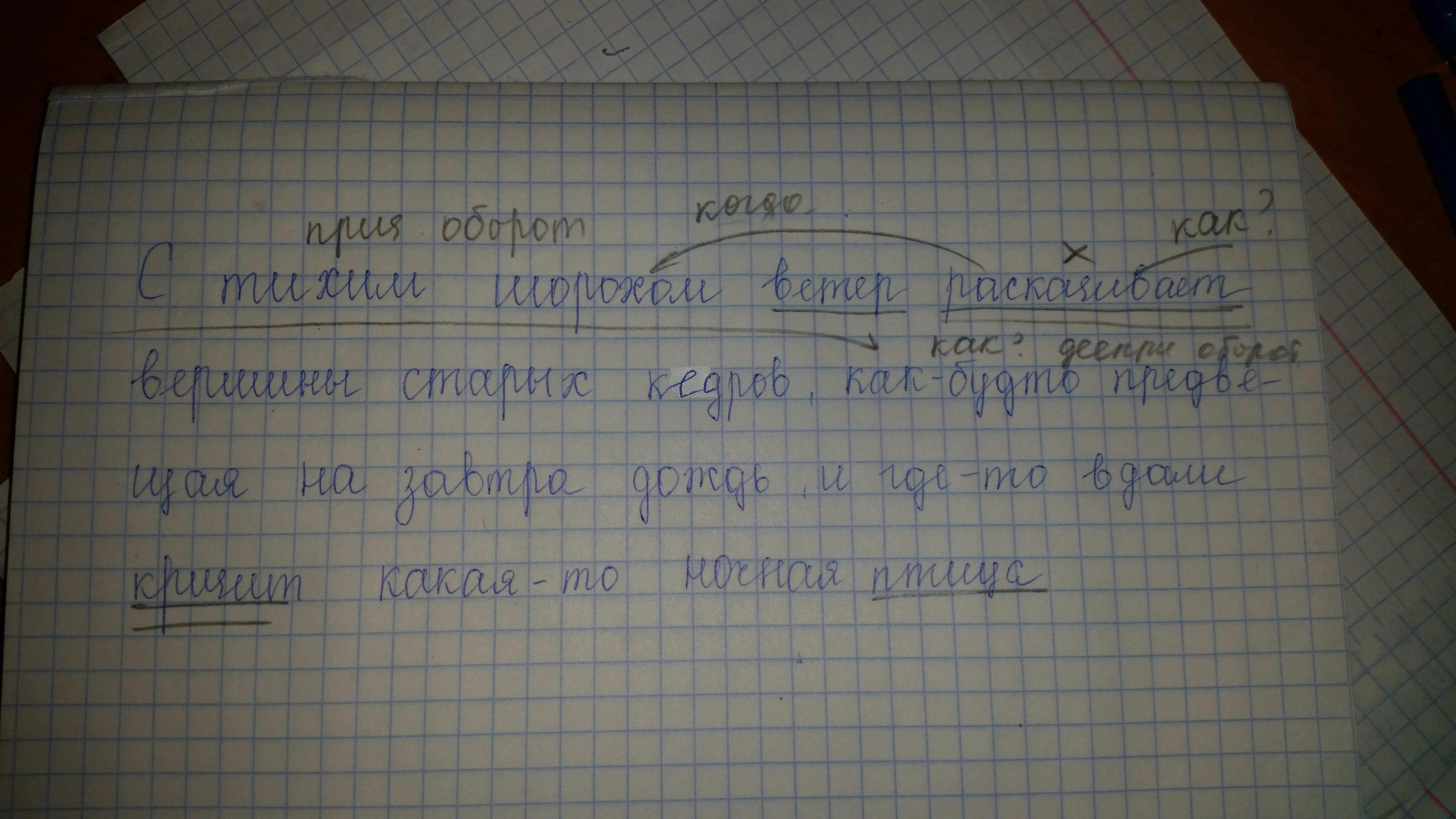 С тихим шорохом ветер раскачивает вершины старых кедров, как будто предвещая на завтра дождь, и где-то вдали кричит какая-то ночная птица. Объясните запятые и грамм основу, причастный и деепричастный оборот