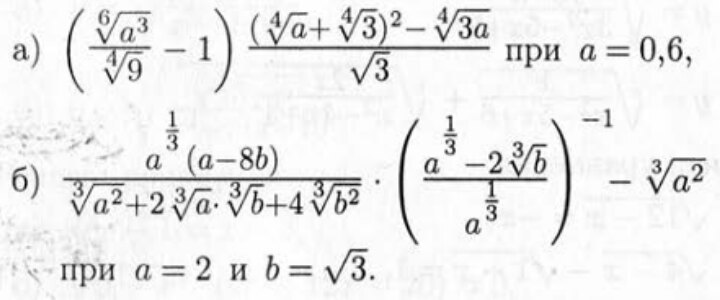 корни переводим в степени (степень над числом в числитель, а степень над корнем в знаменатель). потом переворачиваем дробь со степенью -1. раскрываем скобки (при умножении степени складываем). сокращаем и получаем ноль