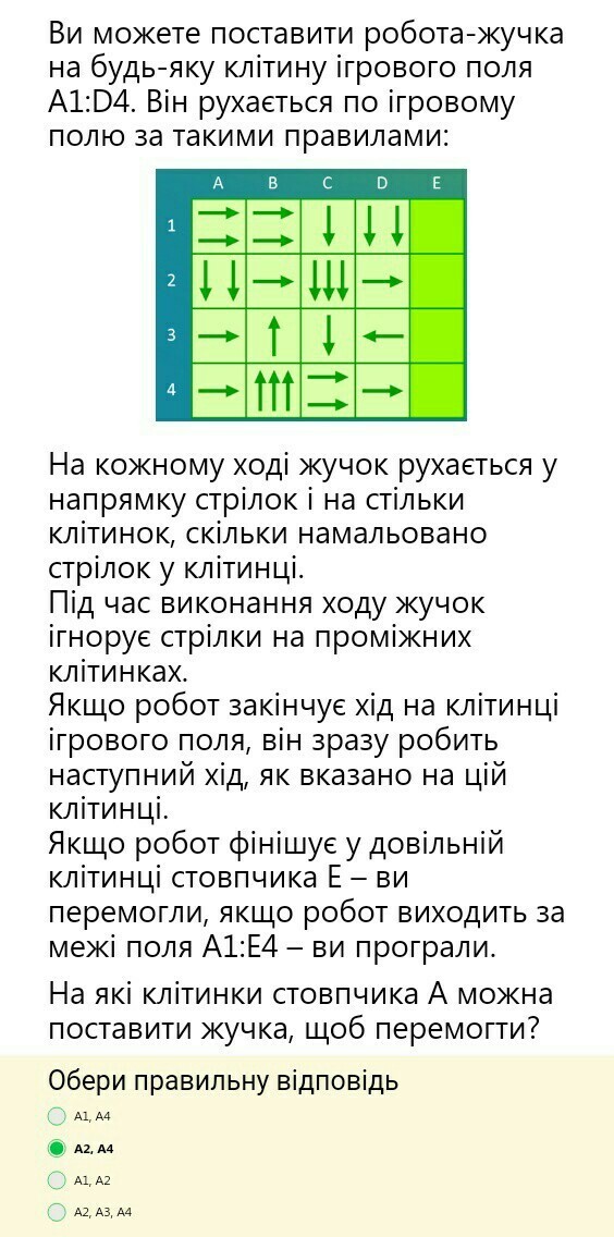 Вы можете поставить работа - Жучка на какую - либо клетку игрового поля А1:D4. Он движется по игровому полю по следующим правилам: На каждом ходе жучок движется в направлении стрелок и на столько ячеек, сколько нарисовано стрелок в ячейке. Во время выполнения хода жучок игнорирует стрелки на промежуточных клетках. Если робот заканчивает ход на клетке игрового поля, он сразу делает наступление нии ход как указано на этой ячейке. Если робот финиширует в произвольной ячейке колонки Е - вы победили, если робот выходит за приделы поля А1:А4 вы проиграли. На какие клетки можно поставить жучка, чтобы победить? Выбери правильный ответ
