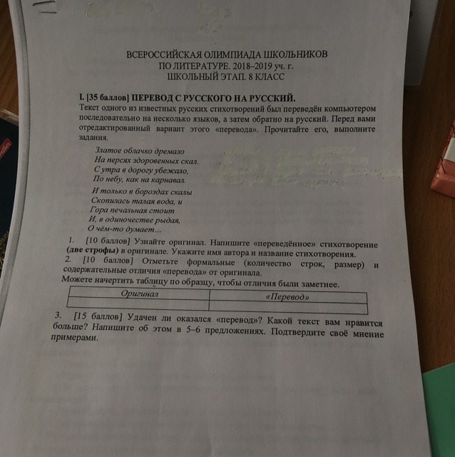 В стихотворении Лермонтова 8 строк, в «переводе» 9 строк. Стихотворный размер оригинала – хорей, «перевода» - ямб. Во второй строфе перевода отсутствует рифма, у Лермонтова обе строфы зарифмованы. Содержательные отличия: У Лермонтова утес старый, одинокий; в переводе – скалы, причем «здоровенные», что не совпадает с образом одинокого старого утеса. У Лермонтова сильный образ морщин утеса, а в переводе просто «борозды». Влажный след у Лермонтова , а в переводе талая вода – неудачная, не соответствующая оригиналу замена. У Лермонтова утес тихонько плачет, в «переводе» - рыдает. Тихонько плакать и рыдать – это не синонимы.