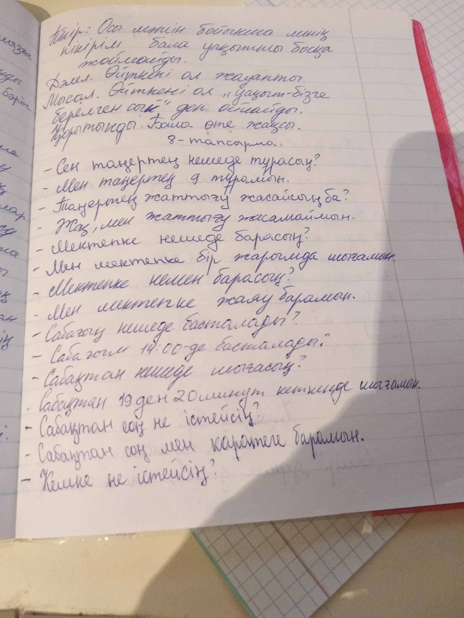 Мен сабақтан соң үйге келіп үй жұмысын жасаймын