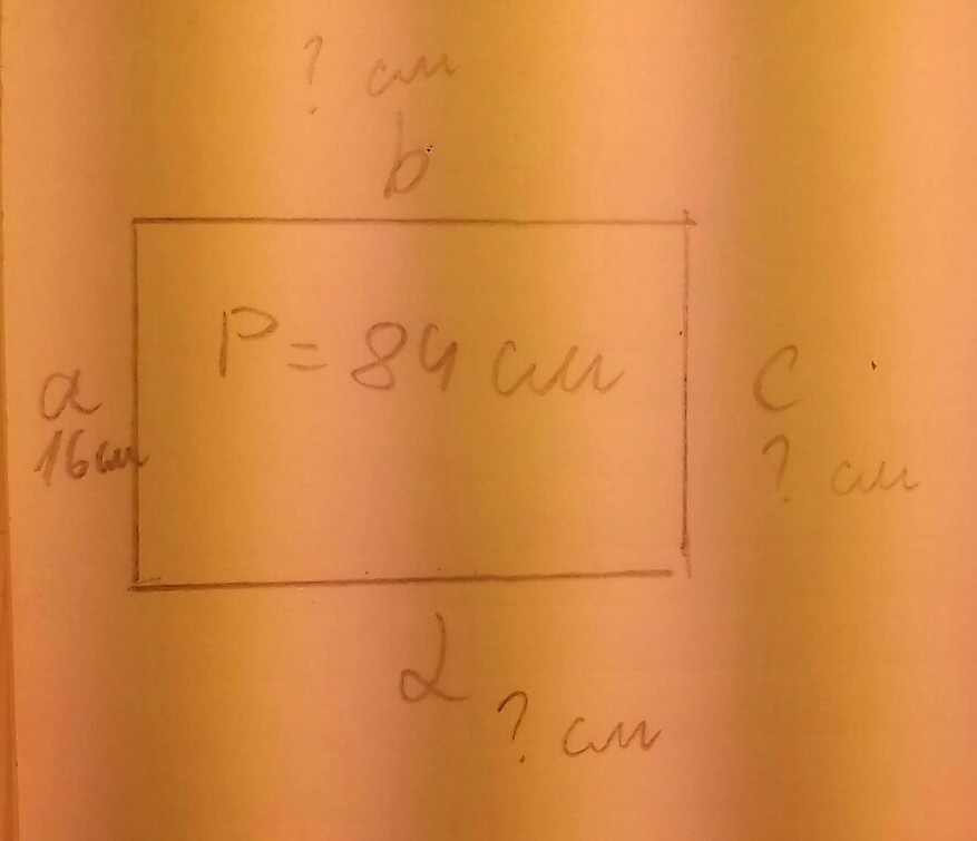 Периметр прямоугольника 84 см длина одной его стороны 16 см найти длины 3 других сторон этого прямоугольника