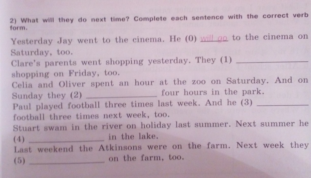 1. will go, 2. will spend, 3. will play, 4. will swim, 5. will be