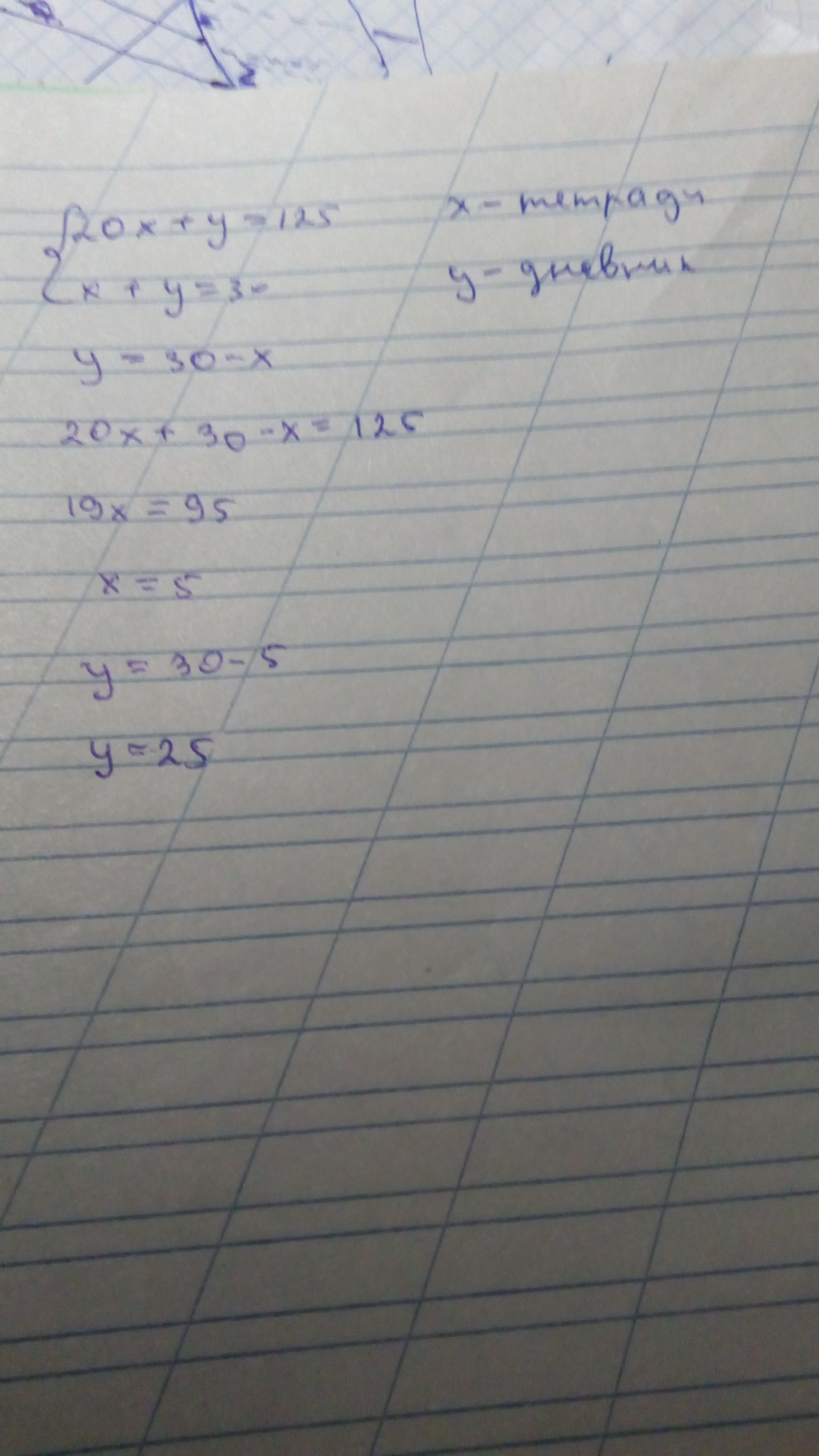 за 20 тетрадей и один дневник ученик заплатил 125 тенге какова цена одной тетради и цена 1 дневника по отдельности если за одну тетрадь и один дневник ученик заплатил 30 тенге решать системой