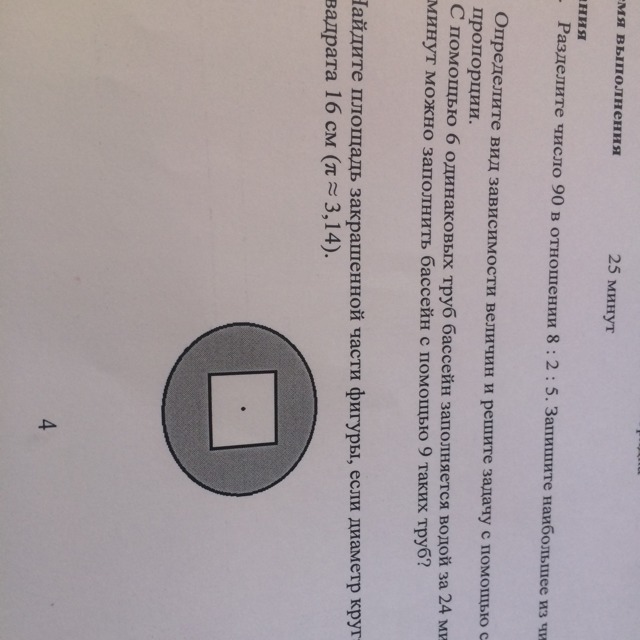 Найдите площадь Закрашенной части фигуры если диаметр круга 10 см а периметр квадрата 16 см