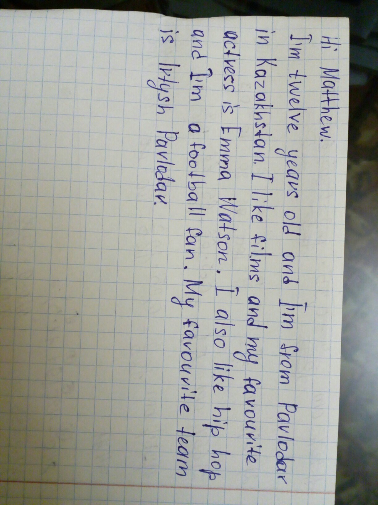 Здарова, Мэтью. Я Казахстанский паладин, мне 12 лет. Я люблю фильмы, моя любимая порноактриса - Эмма Вотсон. Мне нравится чпок-чпок и футбол. Моя любимые команда - иртыжские паладины