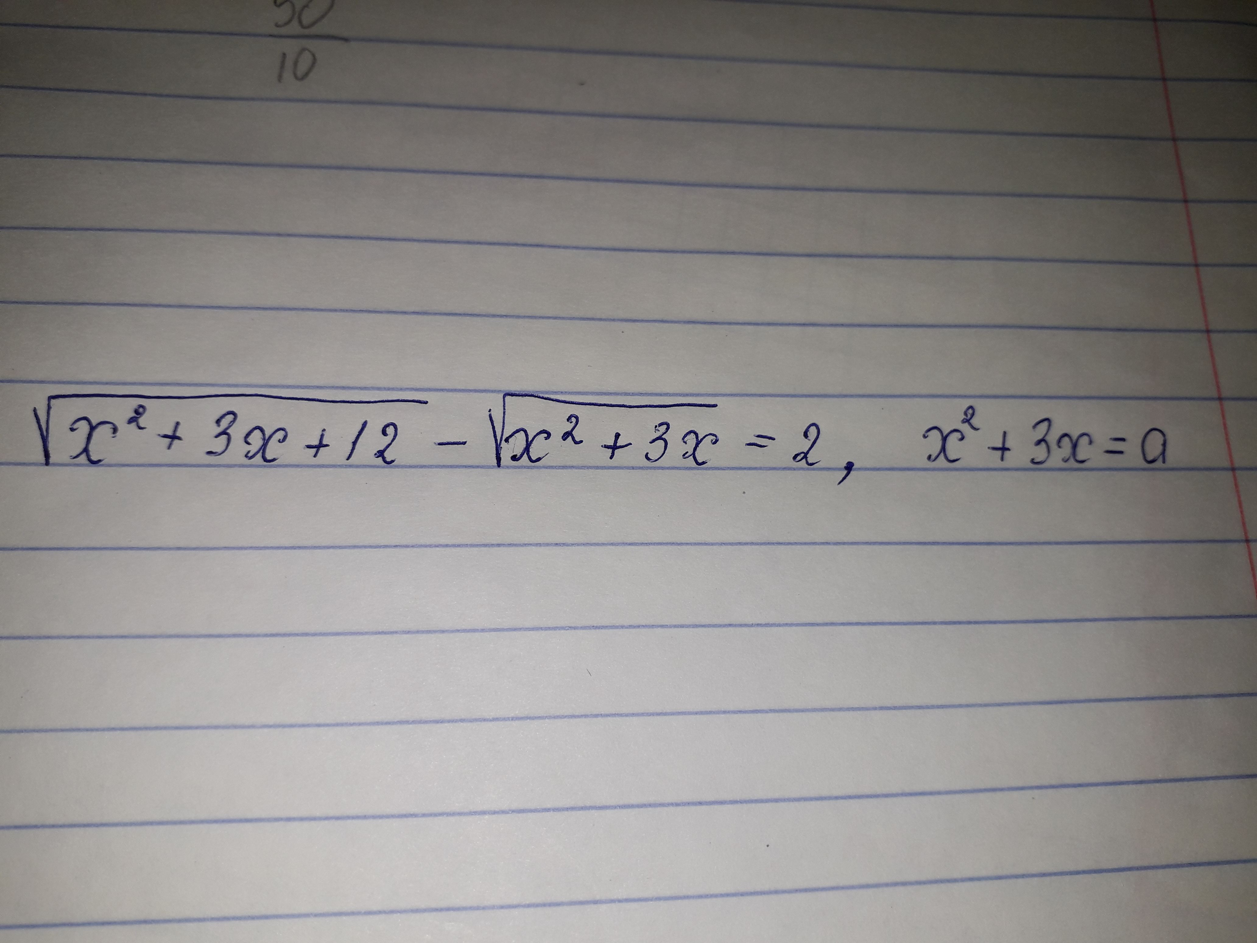 sqrt{x^2 + 3x + 12} - sqrt{x^2 + 3x} = 2 \ a = x^2 + 3x \ sqrt{a + 12} - sqrt{a} = 2 |^2 \ 2a + 12 - 2sqrt{a^2 + 12a} = 4 \ a + 4 = sqrt{a^2 + 12a} \ a^2 + 8a + 16 = a^2 + 12a \ 4a = 16 \ a = 4 rightarrow x^2 + 3x - 4= 0 rightarrow (x + 4)(x - 1) = 0 \ x_1 = 1 \ x_2 = -4