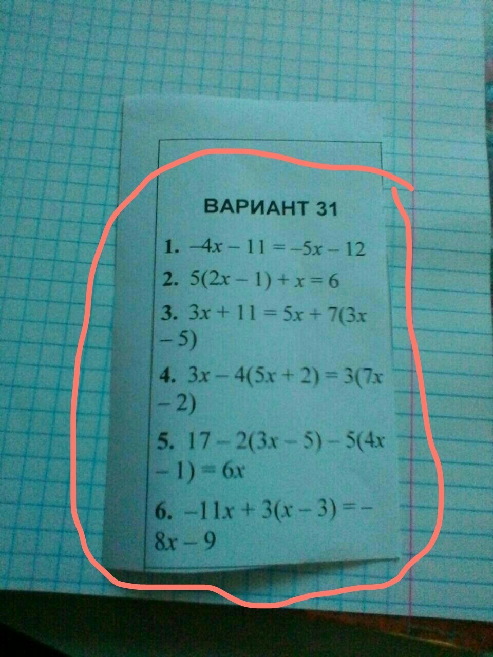 17-2(3x-5)-5(4x-1)=6x